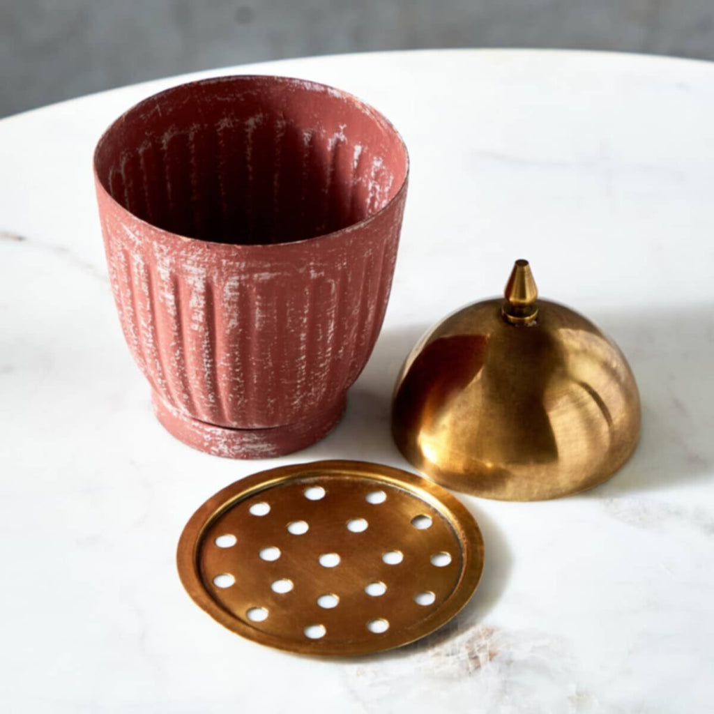This splendid metal incense burner adds a touch of charm and fragrance to any room. This burner is designed with intricate detailing and a rustic finish, giving it a unique and vintage appeal. It's the perfect addition to your home d cor, whether you're looking to create a relaxing ambience or simply add a touch of style.The product images have props used for illustrative purposes.