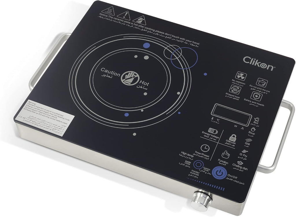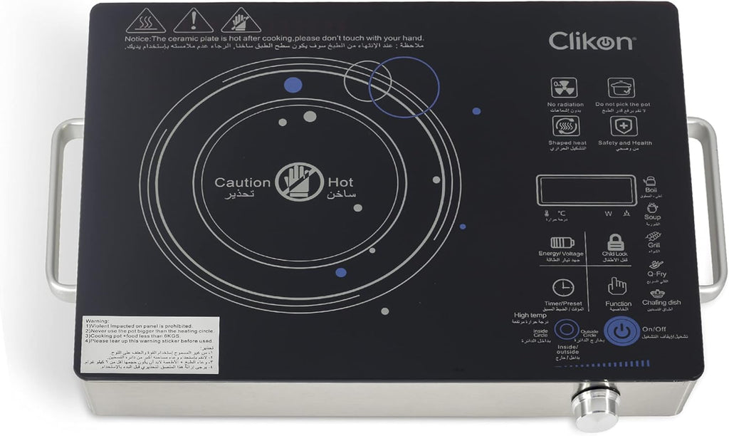 Experience efficient and versatile cooking with the Clikon CK4282 Infrared Cooker. Designed to cater to modern kitchen needs, this cooker boasts a powerful 2200W output, ensuring rapid heating and consistent performance. Its dual ring heating system allows for optimal energy usage, accommodating both large and small cookware. The high-tempered crystallite panel not only adds a sleek touch to your kitchen but also ensures durability and easy maintenance. With features like touch control, digital display, and multiple power and temperature settings, the CK4282 offers precision and convenience at your fingertips. Safety is paramount, and this cooker delivers with its automatic power-off protection and zero radiation design. Compatible with all types of utensils, the Clikon CK4282 is the perfect addition to any kitchen seeking efficiency and style.
