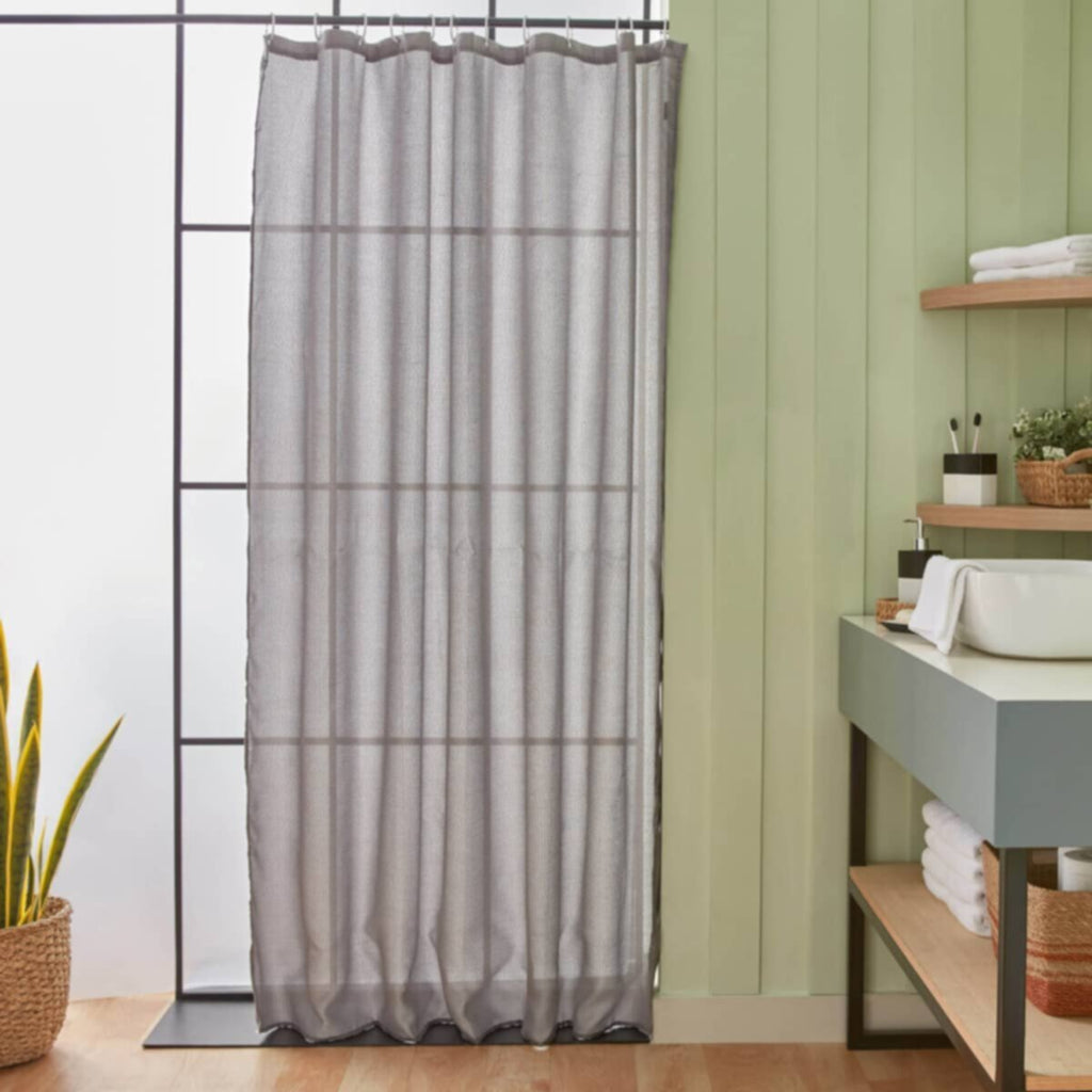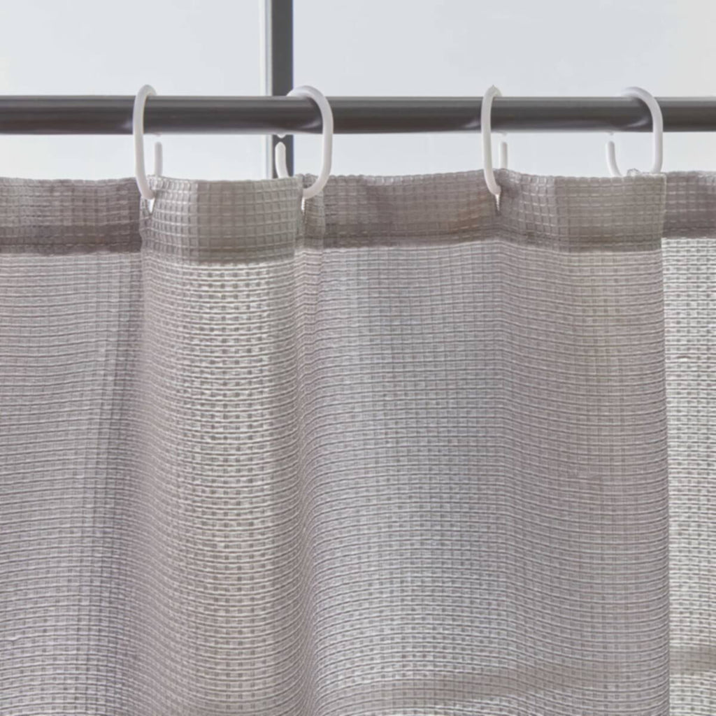 This shower curtain adds a touch of sophistication to your bathroom with its solid jacquard design. Made from durable polyester, it ensures privacy. The curtain comes with twelve hooks for easy installation.The product images have props used for illustrative purposes.