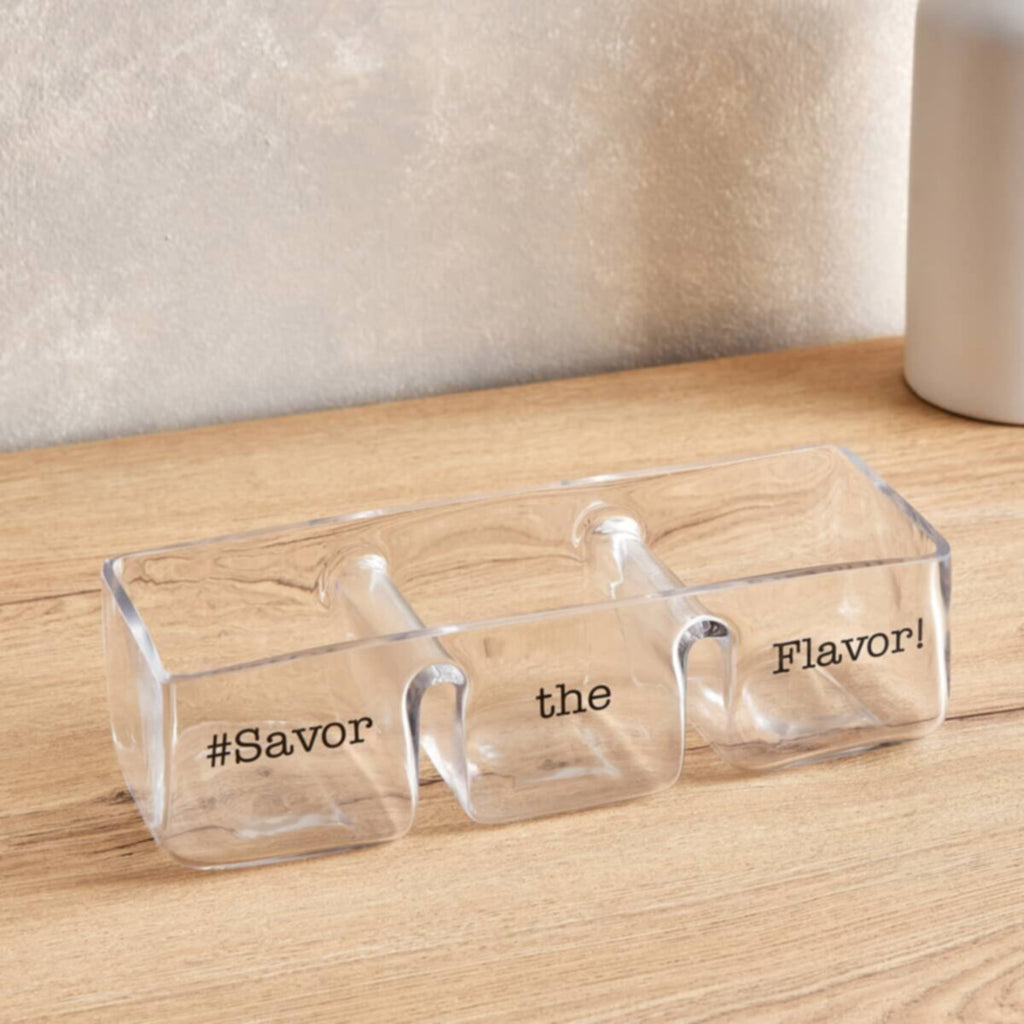 With this appetiser set, you can serve your guests a variety of treats with a modern flair. This item showcases three compartments and is made from high-quality glass, ensuring food safety and an elegant presentation. It has a sleek and contemporary design that will complement any table setting. The product images have props used for illustrative purposes.