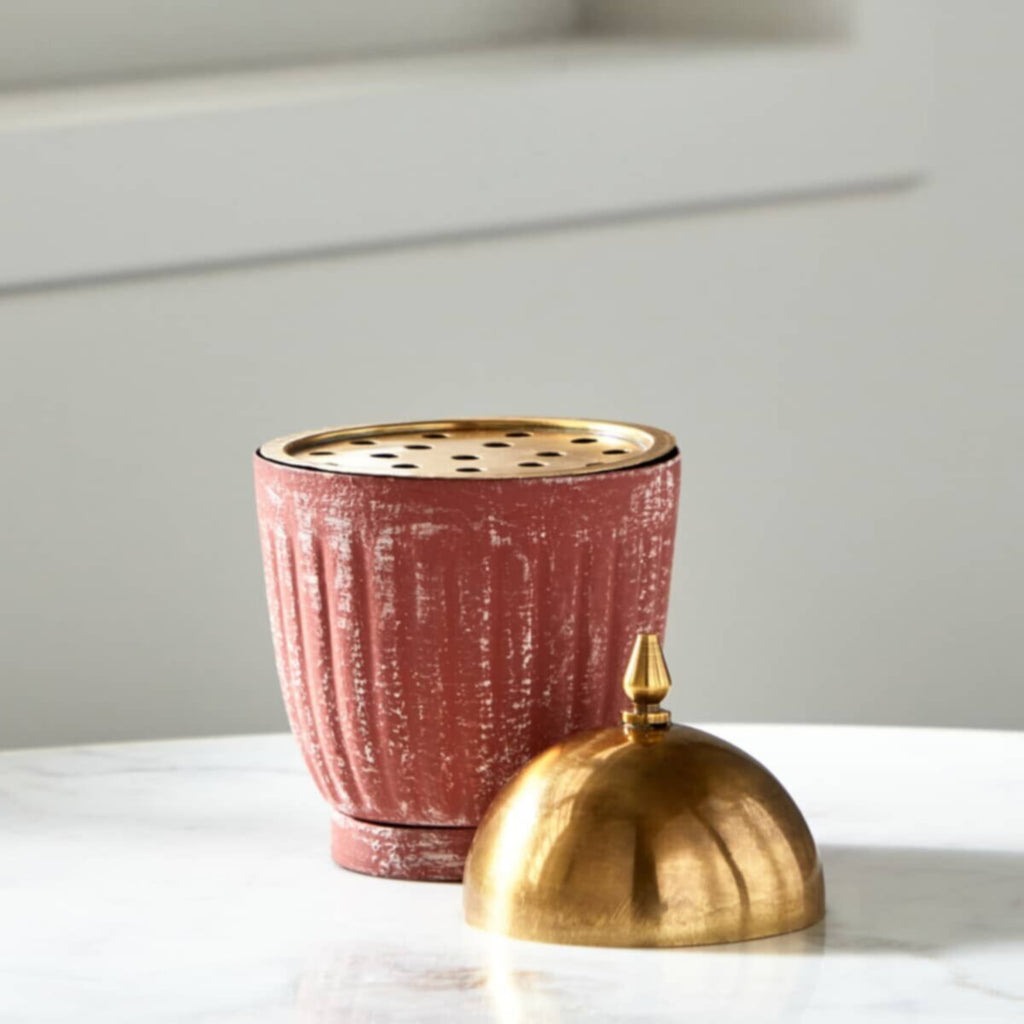 This splendid metal incense burner adds a touch of charm and fragrance to any room. This burner is designed with intricate detailing and a rustic finish, giving it a unique and vintage appeal. It's the perfect addition to your home décor, whether you're looking to create a relaxing ambience or simply add a touch of style.The product images have props used for illustrative purposes.