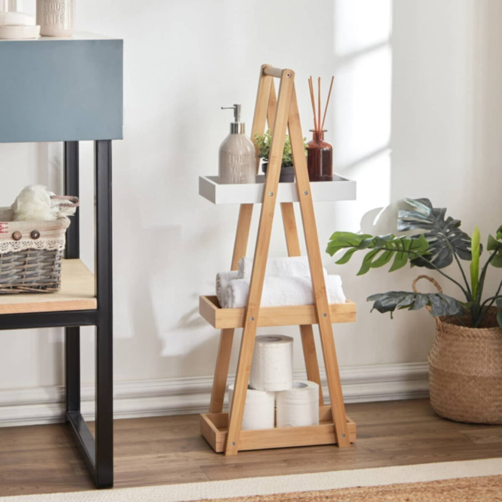 Keep your living spaces neat and tidy by organising bathtime essentials with this rack. It is made from durable bamboo and MDF to be a lightweight yet sturdy addition to your bathroom furniture. The rack has three accessible shelves to hold anything from your grooming must-haves to extra linen.The product images have props used for illustrative purposes.
