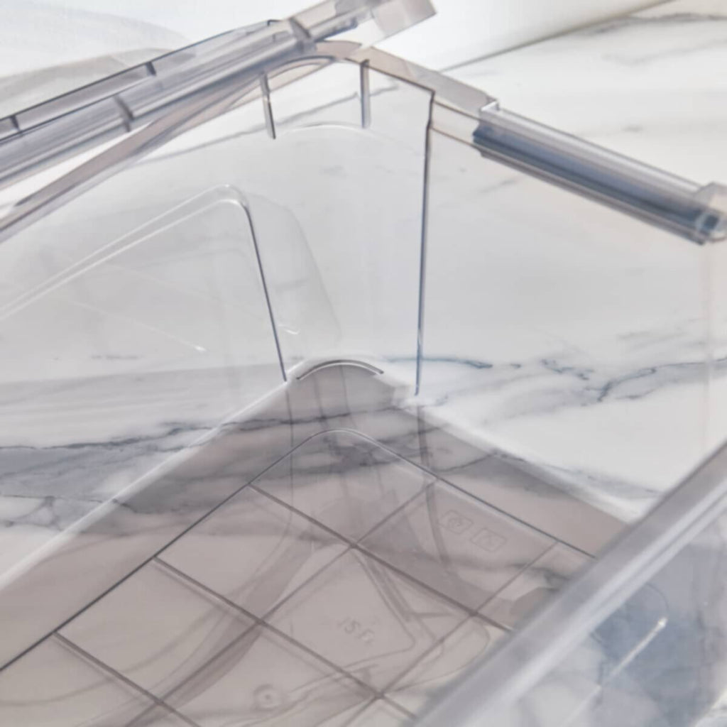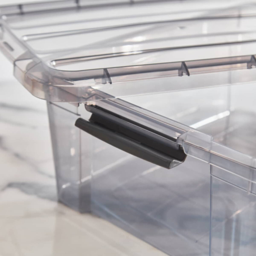 Ensure a neat look at your surroundings with this box. Made from quality material, the box showcases a transparent design with clip locks on the side. This space-saving storage box is durable and worth buying.The product images have props used for illustrative purposes.