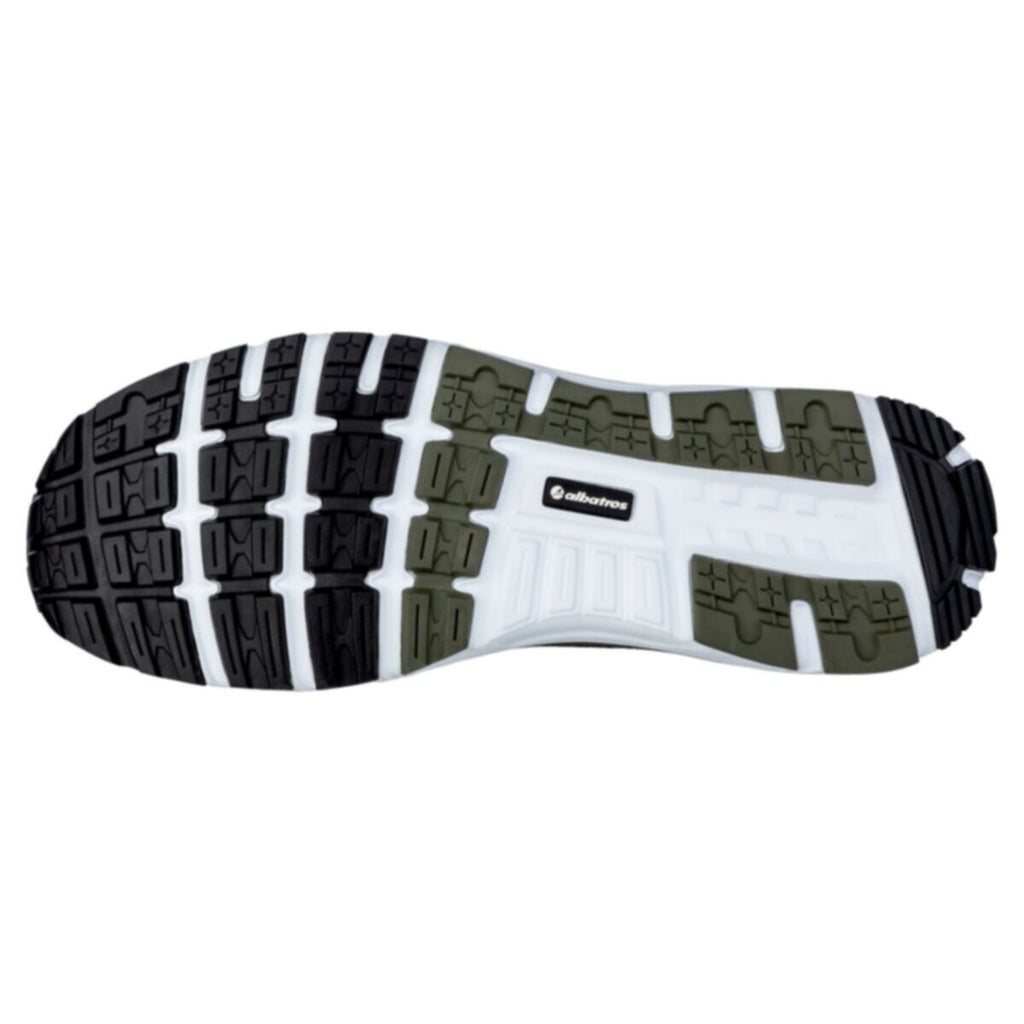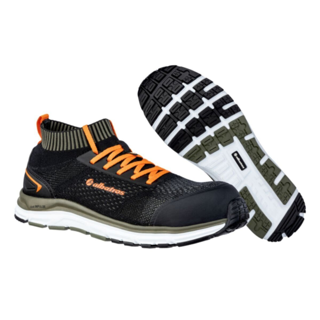 ULTIMATE IMPULSE OLIVE LOW - EXACTLY YOUR COLLAR SIZE! The brand new men's safety shoe ULTIMATE IMPULSE OLIVE LOW by Albatros shines with innovative technologies, high quality materials and the most modern design. The high-performance upper made of SafetyKnit fits perfectly to your foot. Unique in the safety shoe sector, the ELASTIC FIT waistband provides a sock-like fit, giving you the ultimate in comfort and freedom of movement. Dust, dirt or small parts have through the ELASTIC FIT collar no chance to get into your shoe - just your collar size!Visually too, the Albatros ULTIMATE IMPULSE OLIVE LOW is the absolute eye-catcher. Various details in bright orange give the safety shoe fashionable accents and are also super functional. The heel pull on the heel makes it easy to get in and with the laces you can adjust the fit of the shoe even more individually to your foot.In applications such as industry, assembly or storage until you are well equipped with this safety shoe. The specially developed dual.IMPULSE sole with a midsole made of IMPULSE.FOAM in two different densities actively gives you up to 55% energy at every step, ensuring maximum cushioning and excellent stability. So that you can work without fatigue and show constant high performance. The comfit® AIR footbed with a unique honeycomb structure adapts perfectly to the foot and is extremely breathable due to numerous pores. Longitudinal arch support stimulates your muscles while walking, and the natural posture of the foot is supported, so you'll be able to get through the day ergonomically and never lose comfort on long work days. Also for kneeling activities you are ideally equipped with this shoe, because it is equipped with a robust TPU front cap protection and heel protection.With the new ULTIMATE IMPULSE BLACK LOW, Albatros has developed a very lightweight, flexible and extremely comfortable men's safety shoe that you should not miss!