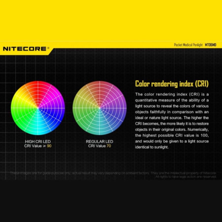 _x000D_Doctors, nurses and EMTS will find the MT06MD ideal for pupil examination and injury diagnosis thanks to the diffused beam and high CRI rating (>90) of the Nichia 219B. Not only will this penlight reveal color more accurately, but the output has an RG0 rating to eliminate blue-light hazards. The MT06MD isn’t only for medical professionals, either. Operating on 2 easily sourced AAA batteries and offering a runtime of up to 35 hours, the MT06MD works great for household chores - especially work in close quarters where a flood of light is essential.