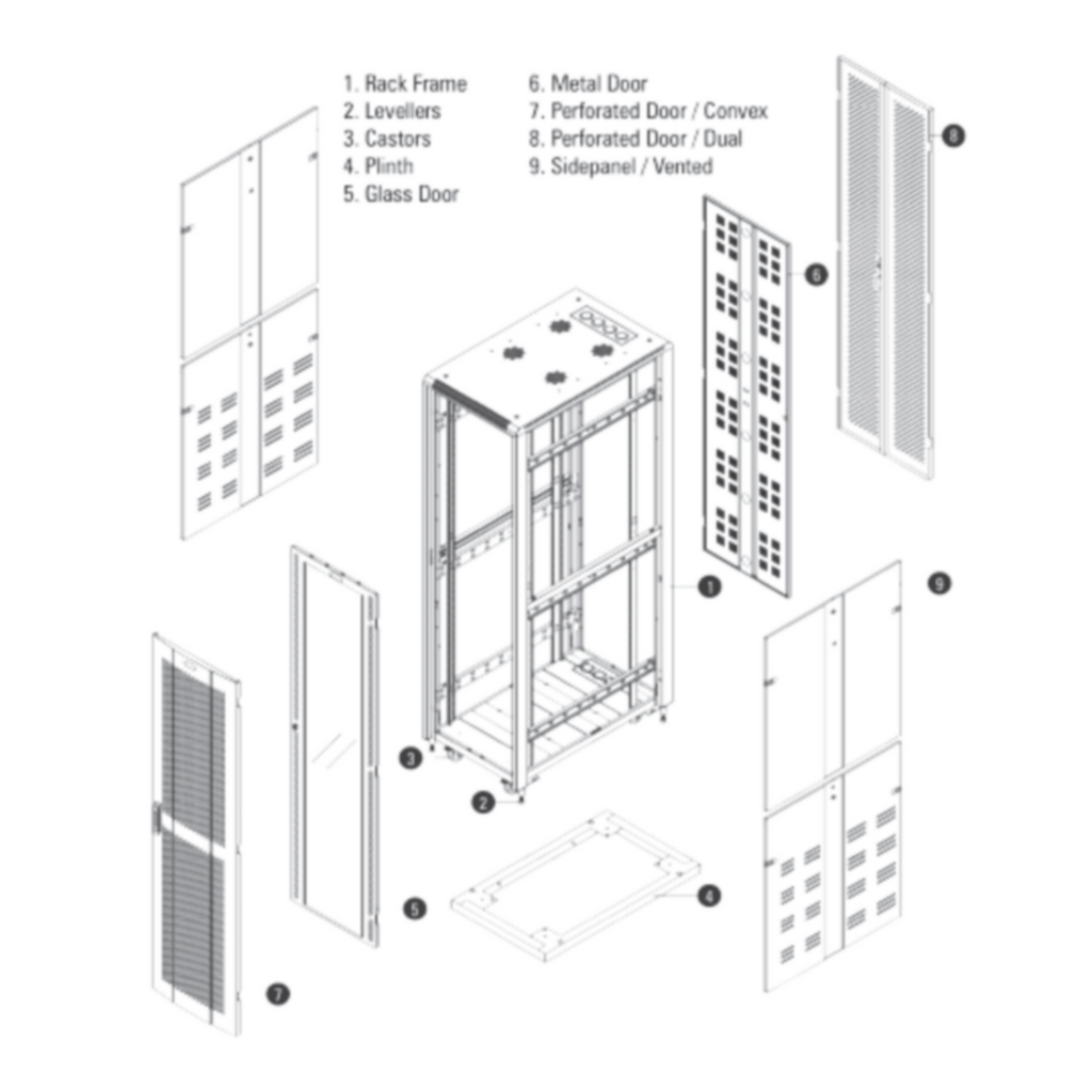 â—† Mounting profile 2.0mm, frame 1.2mm front glass, rare perforated door, feet, caster lockable wheel, 1no tray, 1no 6way UK PDU, 2no vertical cable manager, ( 4nos of fan ), 40sets screws, Flat pack.