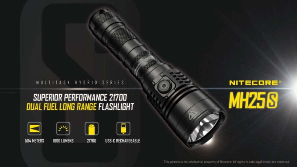 With an output of 1800 lumens and over 501 yards of throw, Nitecore MH25S is the brightest long lasting tactical flashlight for everyday carry, period! MH25S has incredible power options between the included 5000mAh 21700 battery and a battery case for 18650, CR123 and RC123 compatibility. The integrated USB C port allows for very fast charging. 1500 hours of ultra low, which means you can count on the MH25S when you need it. EDC ready at only 6.18 long, and weighing only 7.18 oz with battery included. The MH25S is a great choice as a work light or reflector, with the included hard case, pocket clip, and lanyard. Be prepared for any situation with two modes of operation. Daily mode gives access to five levels of brightness, plus strobe, beacon, and SOS mode. Tactical mode removes the headlight and SOS modes for more precise lighting control. HA III aluminum construction, IP68 waterproof rating, and advanced temperature regulation help the MH25S withstand any environment. Tactical tail switch allows for constant or momentary illumination. No matter if you use it for daily tasks, on patrol, or for trekking and exploration, the MH25S is an indispensable companion day after day.