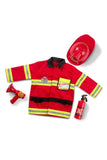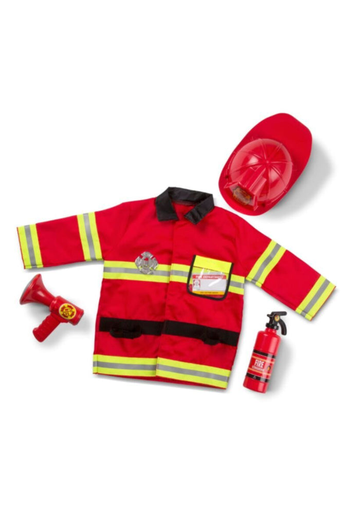Sound the sirens and make way for the rescue! This role play outfit has everything an aspiring firefighter needs in an emergency: a bright red jacket trimmed with reflective material, a fire chief helmet, a "fire extinguisher," a bullhorn with sound effects, a shiny badge, and a name tag so kids can personalize their outfit. The Fire Chief Role Play Set is sized to fit boys and girls ages three to six. The high quality fabrics and solid construction ensure durability so your kids can wear it over and over again. The jacket can be machine washed, and it comes with accessories that can easily be wiped clean. With authentic firefighter details, these role play accessories encourage exciting pretend play for little heroes! The costume set helps promote narrative thinking and creative expression, along with independent and cooperative play. It makes a great gift for kids ages three to six for hands on, screen free play.