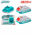 • Package comes with, 2 pcs TFBLI20011 Li ion battery packs, 2.0Ah, 1 pc TFCLI2001 Fast Intelligent Charger, 2000mA