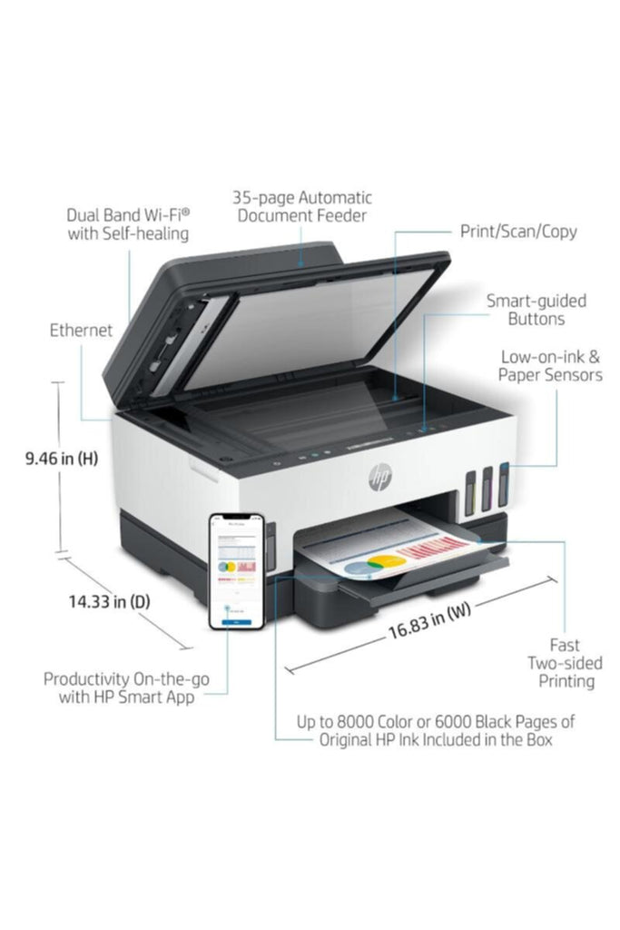 • All in-One printer Streamline your workflow with this all in-one print, copy, scan HP Smart Tank printer that elevates your projects with vivid color prints and dependable flatbed scanning.