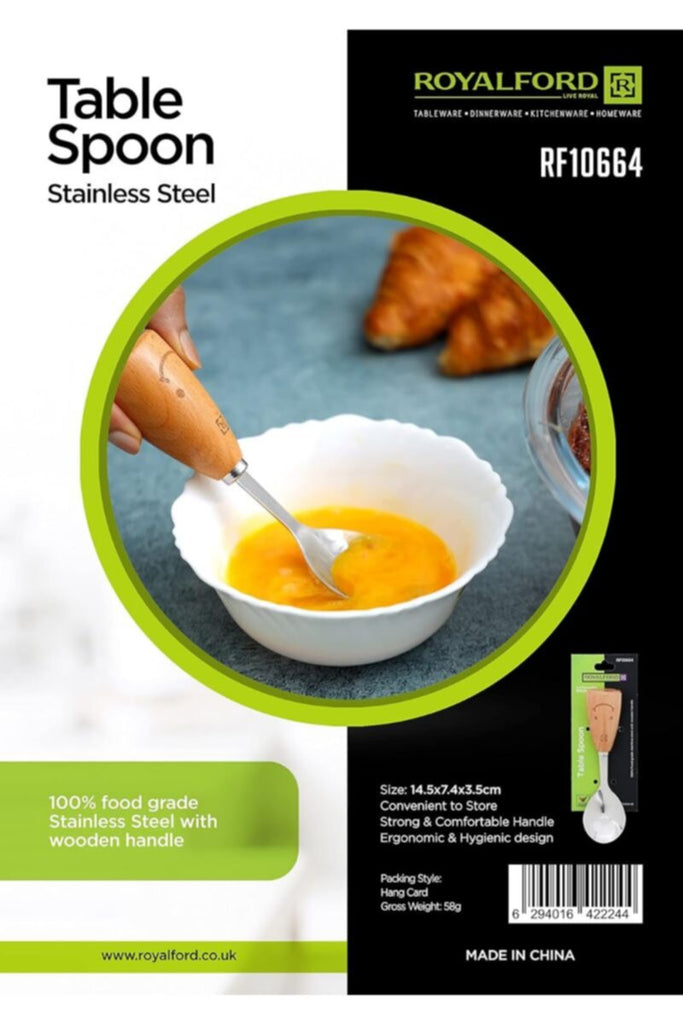The Royalford Table Spoon Is Made Of Good Quality Stainless Steel And Fully Complies With Food Grade Safety Standards, Which Is Rust Proof, Corrosion Resistant, Non Toxic, And No Metal Aftertaste. Made With Classic Craftsmanship, The Durable Spoon Is Strong And Durable With A Smooth Surface, Smooth Edges, And No Rough Spots. The Typical Shape Design, The Thick Rounded Wooden Handle Is More Ergonomic, And The Moderate Weight Allows You To Have A Better Grip Experience When Mixing.Perfect For Everyday Wear, This Spoon Is Particularly Sturdy Due To Its High Material Thickness And Fits On Any Table And Every Combination Of Decorations And Porcelains. The Classic Multi Piece Design Makes This Set Of Spoons More Cost Effective. Perfect For Dinner, Lunch, And Breakfast. A Great Choice For Cafes, Restaurants As Well As A Home Dinner Table. It May Be Used For A Broad Variety Of Meals From Appetizers And Desserts To Soups And Hot Beverages. It Can Also Be Used As A Measuring Spoon, Yogurt Spoon, Or Dessert Spoon. Great For Home, Offices, Restaurants And Cafs, Dessert Shops, Milk Table Shops, Anniversaries, Weeknight Meals, Table Parties, Etc.