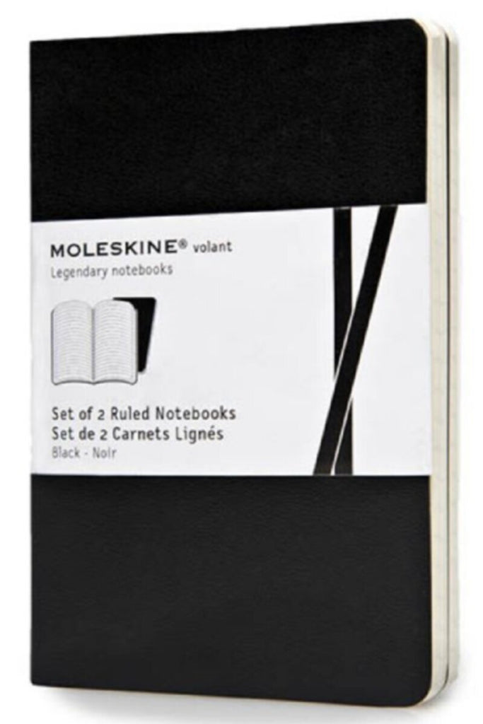 • The Volant notebook with black soft cover come packed in set of two. Each set comes with acid free ruled paper and includes the Moleskine history.