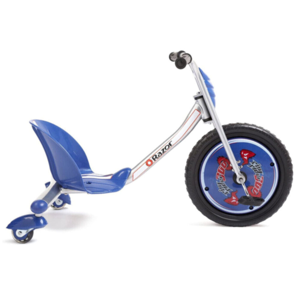 Razor Riprider 360 Drifting Trike Blue. Yes, it has a big wheel and pedals, but that's where the similarities end. This is not a trike for tikes, its the next evolution in everyday fun. Like the classic three-wheeler of the 1970s, the RipRider 360 rides low-to-the-ground. Like no other, thanks to dual-inclined caster wheels, it offers a slick three-wheeler that can perform stunts not seen with other similar trikes. With the RipRider 360, our radical engineers have reinvented childhood, adding two caster wheels in the back for resistance-free drifting and spinning, which is something those big wheel trikes of the plastic kind can't do. You're welcome. Features MX-style handlebar with rubber grips, double crown fork design, and welded steel frame and fork. Using new technology, it enables kids to perform sick tricks, like drifting and 360-degree turns.