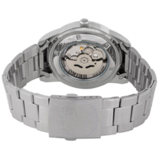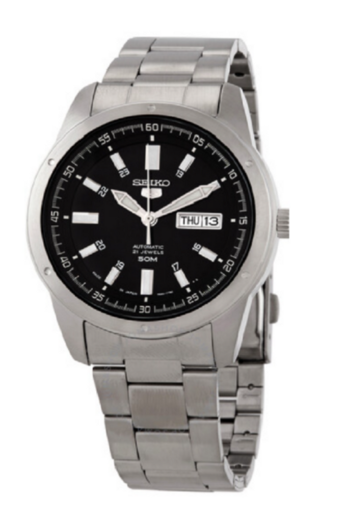 Stainless steel case with a 1 stainless steel bracelet. Fixed stainless steel bezel. Black dial with luminous silver tone hands and index hour markers. 24 hour markers. Arabic numeral minute markers (at 5 minute intervals). Minute markers around the outer rim. Dial Type: Analog. Luminescent hands and markers. Day of the week and date display at the 3 o'clock position. Seiko caliber 7S26 automatic movement, based upon Seiko 7002, containing 21 Jewels, bitting at 21600 vph, and has a power reserve of approximately 40 hours. Scratch resistant Hardlex crystal. Pull / push crown. Transparent case back. Round case shape. Case size: 43 mm. Case thickness: 12 mm. Band width: 22 mm. Fold over clasp with a push button release. Water resistant at 50 meters / 165 feet. Functions: date, day, hour, minute, second. Seiko 5 Series. Casual watch style. Watch label: Made in Japan. Seiko Seiko 5 Automatic Black Dial Men's Watch SNKN13J1.