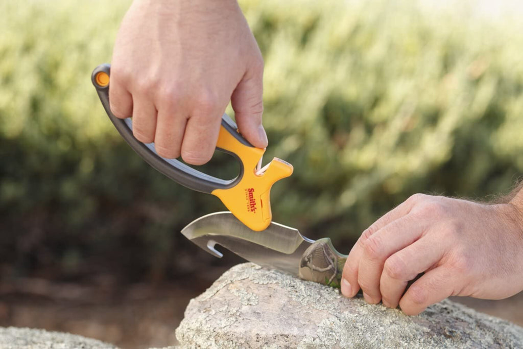 Simple and dependable, the JIFFY Pro Handheld Sharpener is quick, safe, and easy to use in the field, back at camp, or in your home. The knife sharpening slots incorporate crossed carbide blades used to set the edge on your extremely dull or damaged blade and crossed ceramic rods used for honing the final edge to razor sharpness.