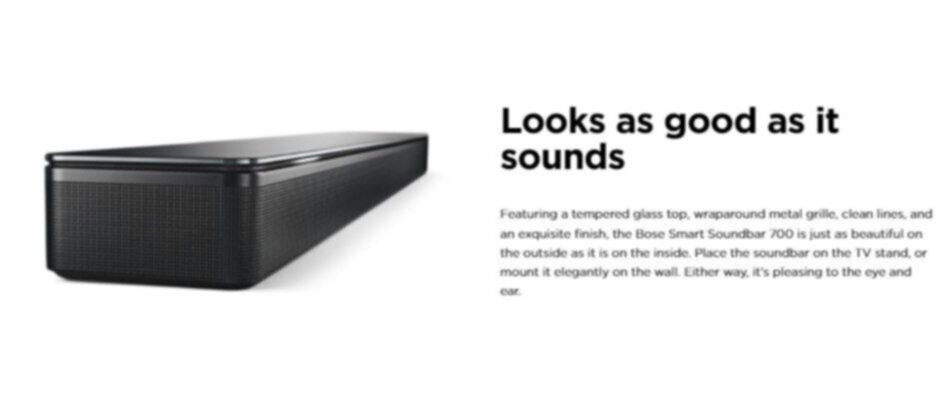 Featuring a tempered glass top, wraparound metal grille and clean lines, the Bose Soundbar 700 is meant to accentuate your room" s decor. But the real beauty is the power beneath the exterior. Custom drivers and proprietary technologies deliver clear, spacious sound, so not only does this soundbar turn heads, it brings new life to all of your entertainment.