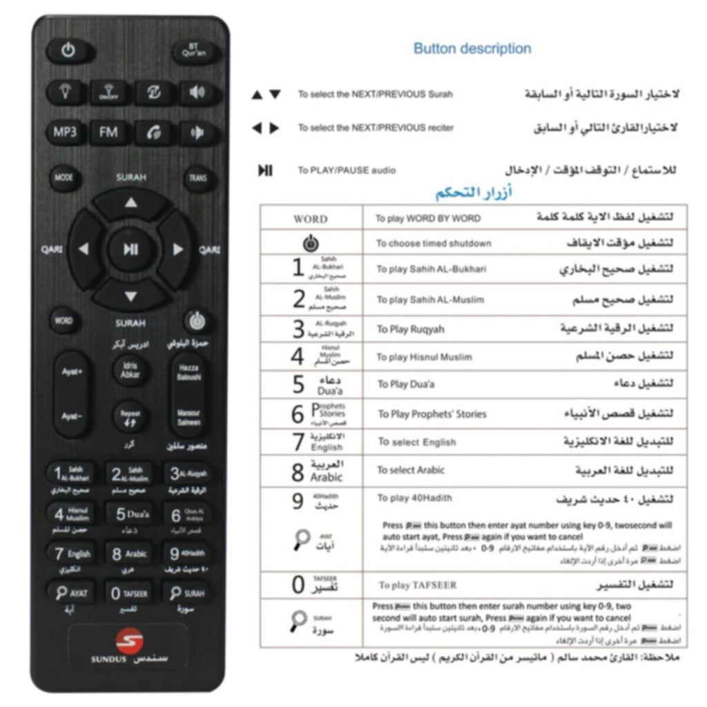 • It contains the entire Qur" an , where you can navigate to select the surah , the reciter" s voice with the remote , and control the volume