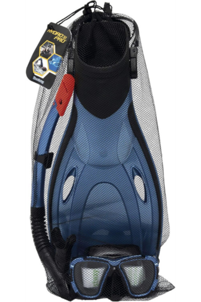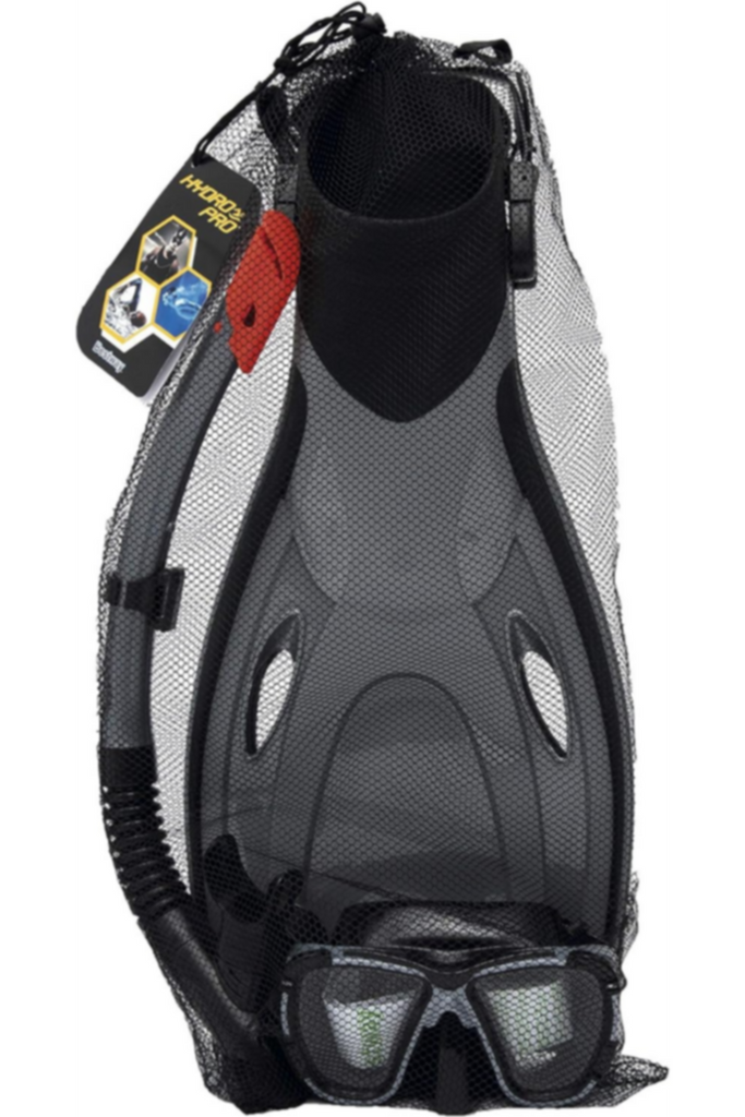The Hydro Pro BlackSea Snorkel Set has everything you need for exploring the wonders of underwater life. The full set includes a snorkel, mask and fins. Tempered Glass Lenses: The BlackSea mask features lenses made of ultra clear tempered glass, a premium durable lens material that is both impact and scratch resistant. The strength of this material makes this mask ideal for diving. Purge Valve & Dry Top Snorkel: This snorkel features a splash guard dry top to prevent water infiltration if you happen to be splashed, making this the perfect snorkeling accessory. In the case of water infiltration, the snorkel also features a purge valve which will allow you to clear the tube of excess water by deeply exhaling. Comfort Fit: The double feathered edge skirt prevents any leaks from entering the mask while also allowing it to sit comfortably on your face. The head strap and snorkel strap retainer are both adjustable so you can get the perfect fit. The snorkel mouthpiece is ortho engineered to prevent any discomfort as you swim. The fins feature an anti skid lower sole and flexible blades for better propulsion and a one touch release button makes it easy to remove them as necessary.