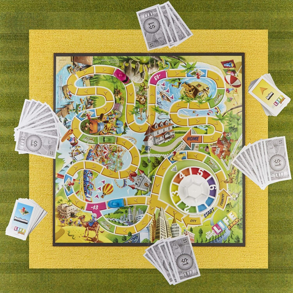 In The Game of Life Junior game, kids embark on an exciting family vacation. Players choose their mover -- a car, train, ship, or a plane -- and head off to their chosen destination. They could visit a jungle, the beach, or even a castle! Earn money towards the win with Animal Action cards. Players show off their skills such as walking like a penguin or making a fish face. An Activity Action card can also earn cash. They encourage kids to engage in conversation about their favorite experiences and other fun topics. Just like with any vacation, there can be setbacks, and Event Action cards have players losing money for things such as lost luggage or forgetting a swimsuit. The player with the most cash at the end of the game wins! Bring out this board game for Family Game Night, play dates, and indoor activities. For kids ages 5 and up. Hasbro Gaming and all related trademarks and logos are trademarks of Hasbro, Inc. Spin to Win is a trademark of The Trustee of the Reuben B. Klamer L.T.
