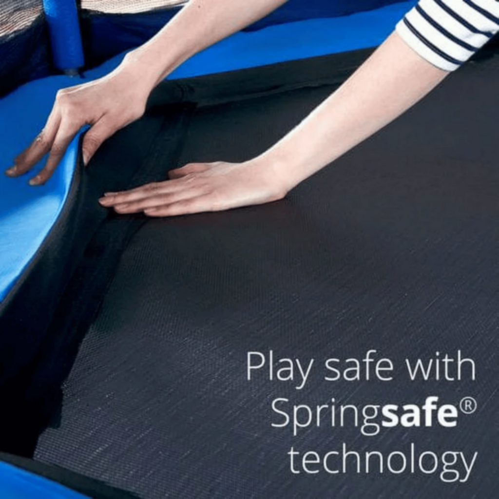 • SAFETY FIRST: Springsafe technology protects little fingers and toes from the springs and frame parts. The thick, weather protected safety padding is sewn to the jumping mat using robust elastic webbing, giving no access to the mechanics of the trampoline.