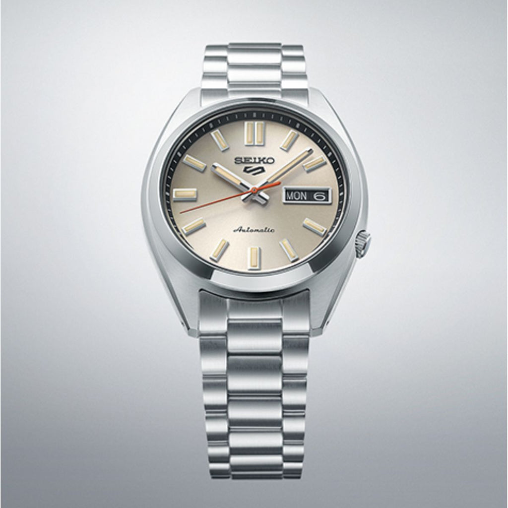 • The sporty ivory dial features an orange seconds hand, which was used in many 5 Sports watches in the 1970s. The multi faceted hour and minute hands reflect light while imparting a strong presence. Lumibrite is applied on the upper surface of the 11 bar indexes and the hour and minute hands.