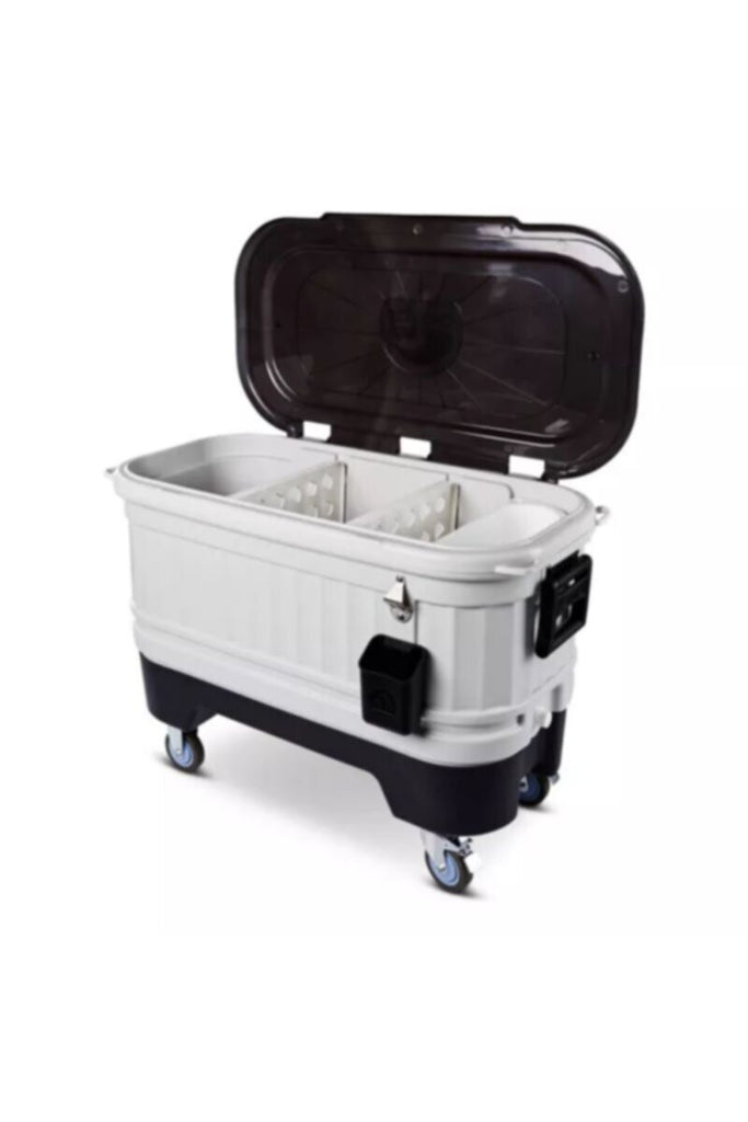Inspired by the outdoor beer chests found at a traditional Texas ice house, the Igloo Party Bar is the ultimate cooler for keeping your party going from day into night. This 125 quart ice chest is the ultimate party cooler for tailgating, outdoor events and more. Featuring a built in bottle opener with cap catch bin, removable drink dividers and bottle caddy, and an easily removable lid; the Party Bar provides all the essentials to entertain. For added convenience, the Party Bar s base with locking casters allows you to move your food and drink from the pantry to the party and is easily removed for use as an ice chest or for storage. Style, function, and easy clean up—the Igloo Party Bar is top notch!
