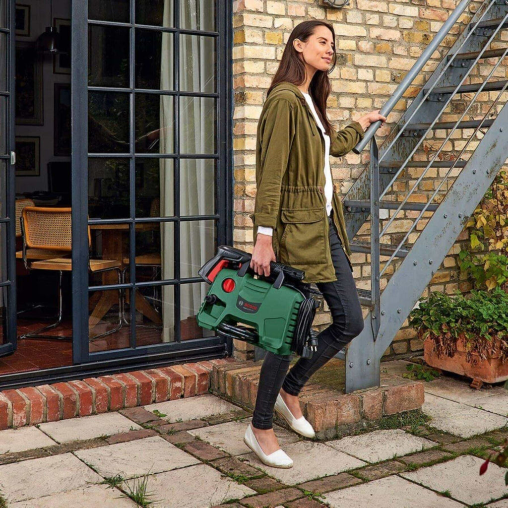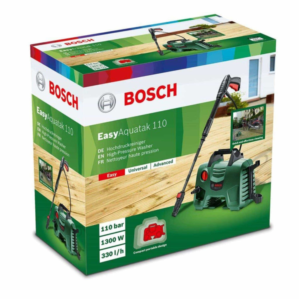 This compact high pressure washer offers fast and effortless cleaning performance. The EasyAquatak 110 is easy to manoeuvre and store due to its compact design and accessory storage. With 110 bar cleaning power and a choice of Variable Fan Jet and Rotary Nozzles, cleaning cars, patios, and garden furniture is easy. Its 450 ml High Pressure Detergent Nozzle reduces cleaning time by applying the soap quickly. Push fit connections and in use gun storage make cleaning simple.