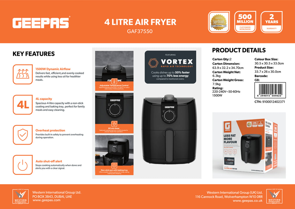 Upgrade your everyday cooking with the Geepas GAF37550 4 Litre Air Fryer, designed to deliver crispy, delicious meals with significantly less oil. Powered by 1500W Dynamic Airflow and Vortex Rapid Air Technology, this air fryer cooks food up to 50% faster while using up to 70% less energy compared to traditional ovens. Its 4L spacious capacity makes it ideal for family-sized portions, while the adjustable temperature control and 60-minute timer give you complete control over frying, baking, roasting, and reheating. Built with overheat protection and auto shut-off, the Geepas air fryer ensures safe, worry-free operation every time. The non-stick coated basket and tray allow easy food release and hassle-free cleaning—perfect for busy modern kitchens.