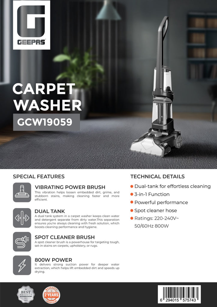 ✅ The Geepas Carpet Washer GCW19059 is designed to deliver powerful, hygienic, and effortless carpet cleaning.
