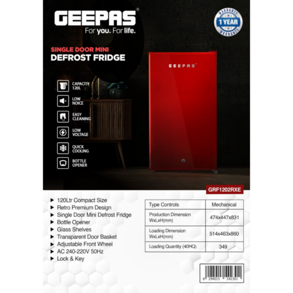 GEEPAS | 120 Litres Single Door Mini Defrost Refrigerator Red | GRF1202RXE