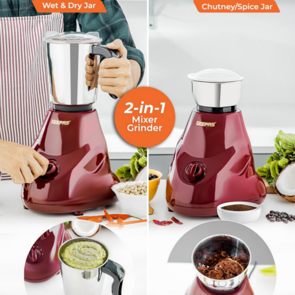 • The Geepas Mixer enables you to prepare your meals with ease and comfort. You just need to load the necessary ingredients into the convenient jars & adjust the appropriate speed. With 550W motor it effortlessly blends species, garlic, onion, salsa, sauces and the toughest ingredients for your easy cooking