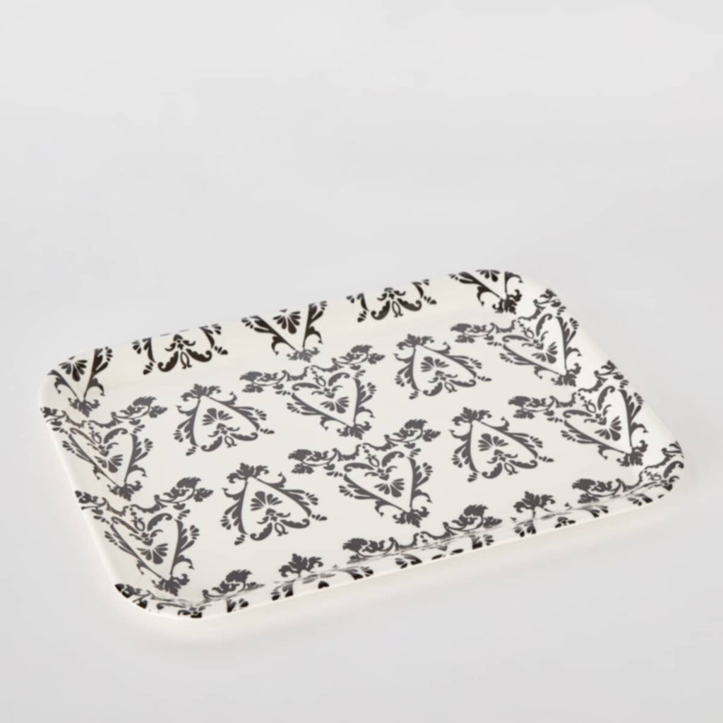The Gusto collection flaunts a lovely black and white theme that has some original form from the art deco movement of the 1920s. Sharp edges with defined linear appearance, Gusto is decorative with elements of geometrical form. Serve your guests elegantly with this rectangular tray enriched by all over ethnic motifs. It is well crafted from food safe bone china and is microwave friendly. This light toned tray will be a classic piece in your serveware collection and is suitable for the dishwasher.The product images have props used for illustrative purposes.