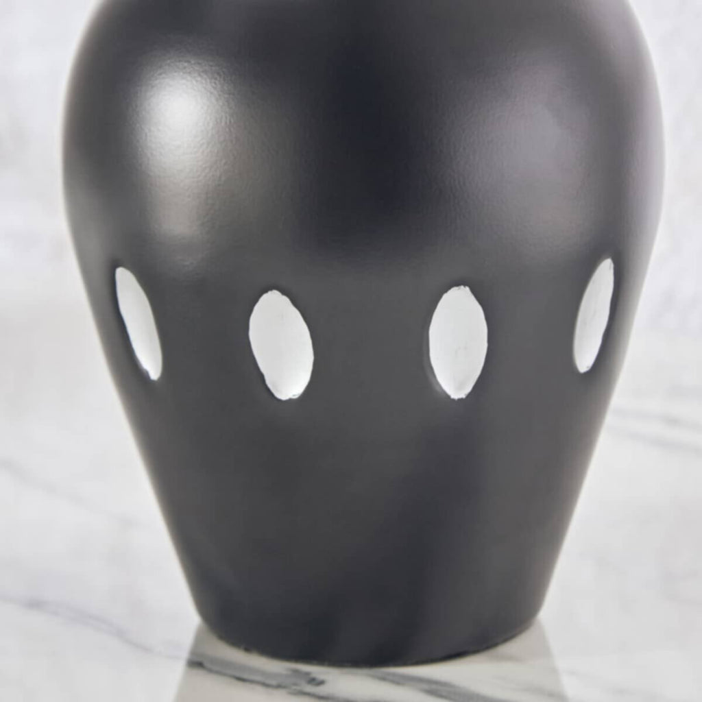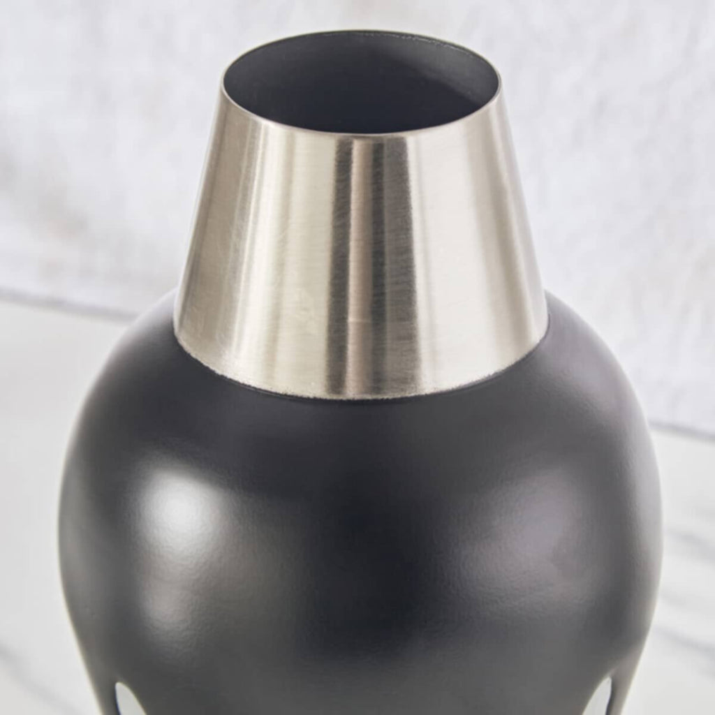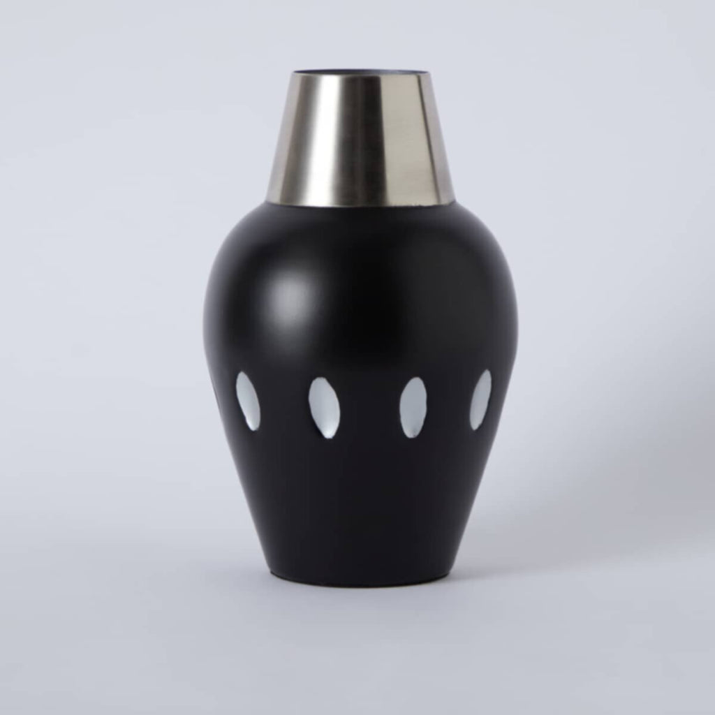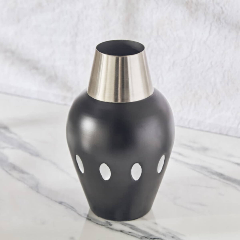 Give a modern touch to your home with this ornate metal vase. This elegant piece is crafted from metal, making it durable and long lasting. The vase features a cylindrical shape, making it a perfect addition to any living room, bedroom or dining room. The product images have props used for illustrative purposes.