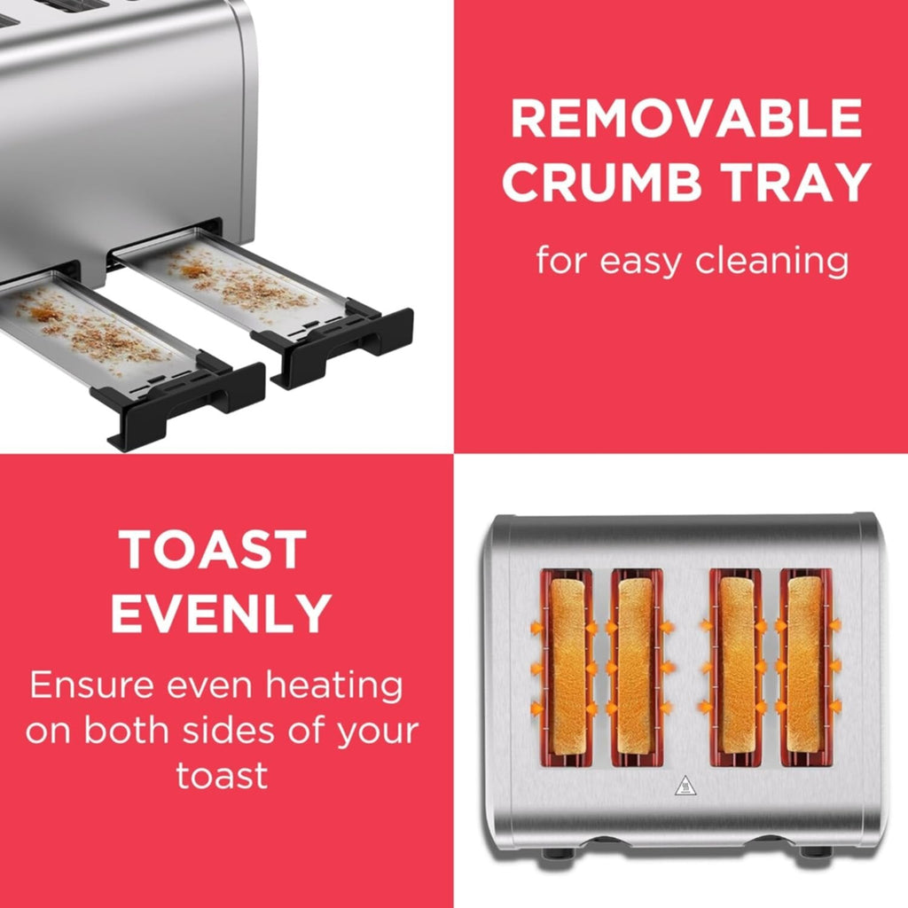 â—† Double-Side Heating, 6- Browning settings, Defrost,Reheated&Cancel function,Wide Slots, Dual Independent Browning, Removable Crumb Tray, Stainless steel.
