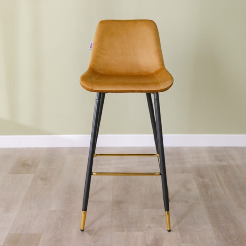 Structured from wood and metal materials with plush velvet fabric upholstery Bar stool has side rail construction for foot rest and to imbue product durability Metal legs with copper sleeves for style and design Can be paired up with different bar table and can also be a stand alone product Easy to maintain Color Available- Brown/Black, Light Blue/Black, Rose/Black, Teal/Black Help incorporate a sense of calmness and serenity into your space with the Kween bar stool in brwn color. The stool is made from wood and metal materials with plush velvet and fabric upholstery. The bar stool comes with a side rail construction that makes for a comfortable footrest while also adding to the product's durability. The legs of the bar stool are made from metal with copper sleeves for style and design. What's better is that it's easy to maintain.