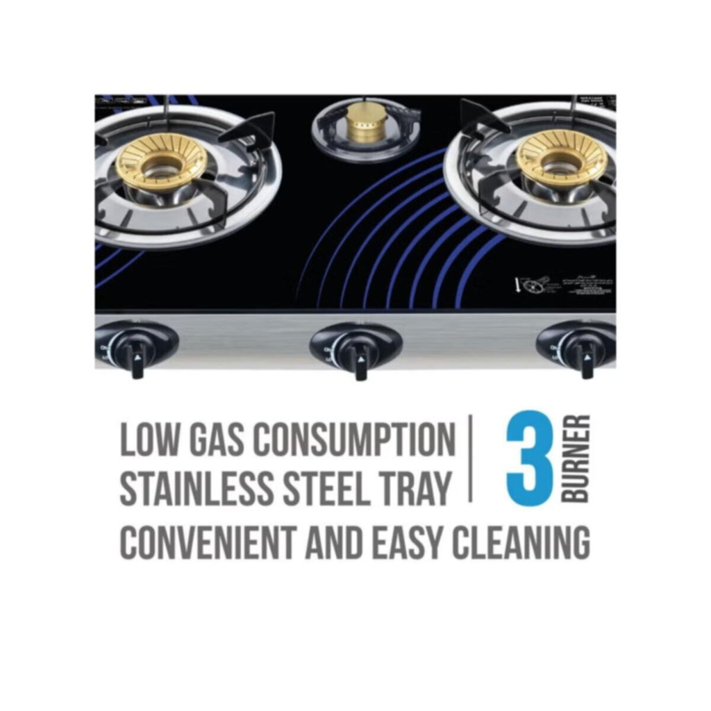 3 Burner Gas Stove. Extra Hard Tempered Glass. 60% Gas Saving.