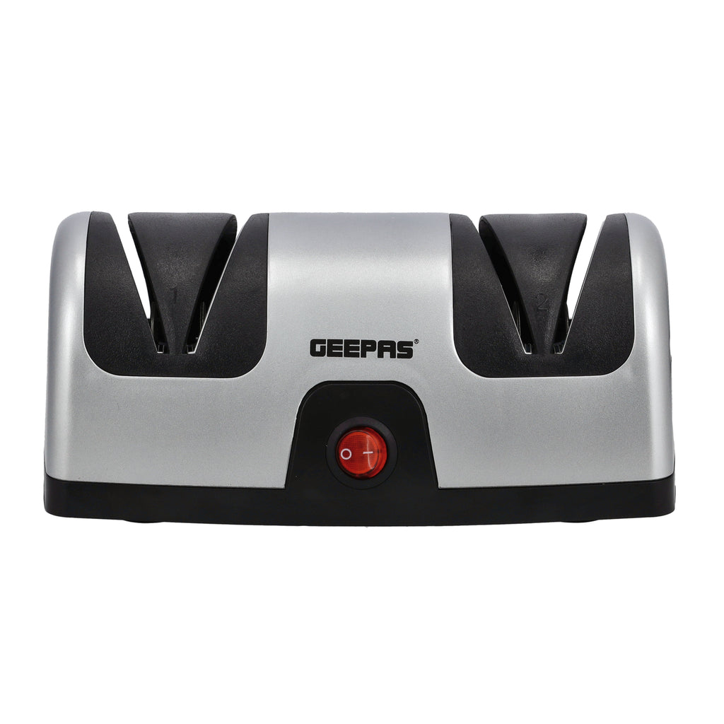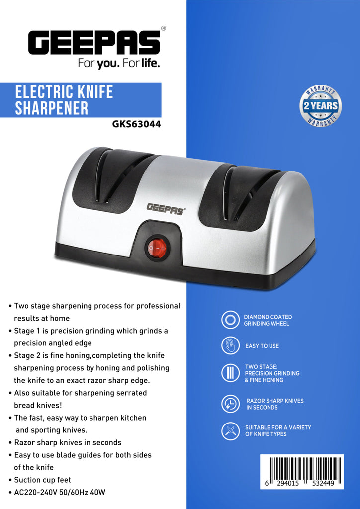 Take the hard work out of keeping a sharp edge with the Geepas Electric Knife Sharpener. Simple and safe to use, this handy tool lets you keep your kitchen knives nice and sharp, making them safer to use as there is less chance of slippage. This knife sharpener uses a 2-stage process for ultimate efficiency. 1st is precision grinding which grinds a precision angled edge,2nd is fine honing, completing the knife sharpening process by honing and polishing the knife to an exact razor-sharp edge. You can use the Geepas Knife Sharpener with a range of knives including alloy, carbon, and stainless-steel blades. The knife sharpener has non-slip feet on the base to keep it safe and secure while it is in use. The 2-stage Knife Sharpening system gives you professional results at home. The fast, easy way to sharpen kitchen and sports knives. Perfect for sharpening all kinds of straight bladed knives, serrated knives, and bread knives Blade guides hold the knife at a perfect angle for sharpening each side of the knife