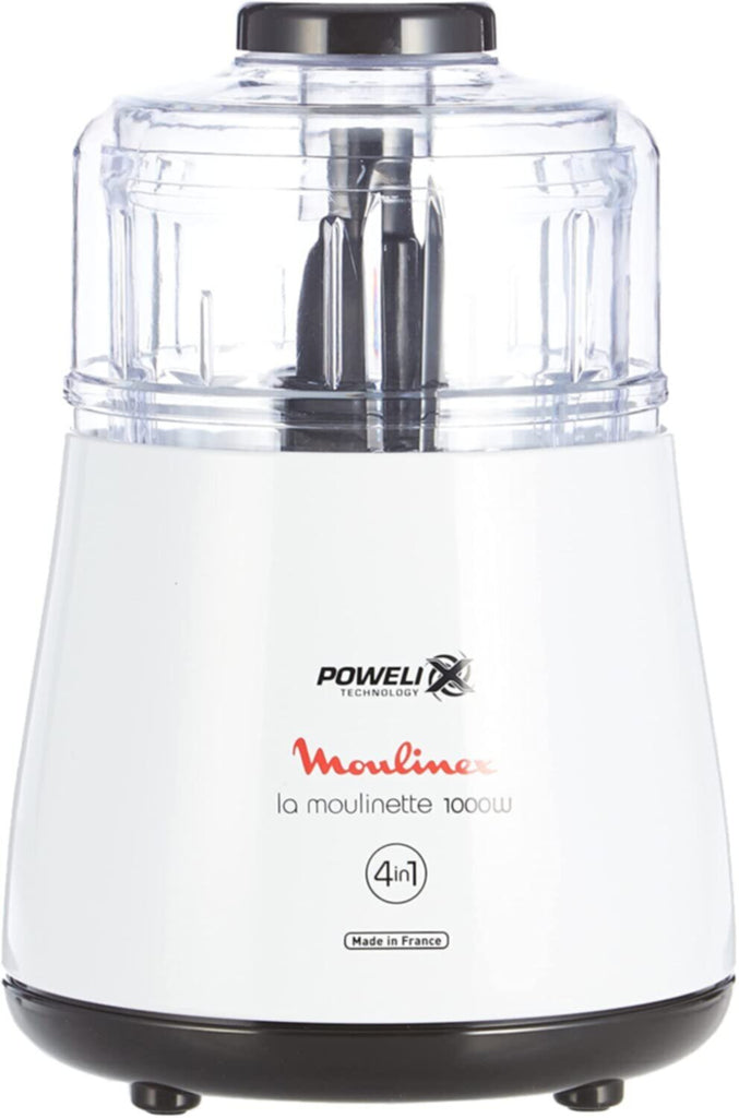 Easy as 1-2-3! With La Moulinette 1000 W, efficient chopping is made easy. Thanks to the exclusive Powelix blades technology, its two ultra-sharp blades tackle everything from raw meat to aromatic herbs, in seconds. Its powerful 1000W motor provides efficient, fast results and features a built-in-motor protection system to protect against overheating, offering increased safety and extended motor life. Meanwhile its 4-in-1 functions make it the ideal helper in your day-to-day home cooking! Chop, mince, mix and grind in a large 500 ml bowl offering big capacity. Rounding it off are a slew of convenient features: practical 1-2-3 simple pressure system for quick results, transparent jug for direct viewing of your preparation, easy to assemble and dishwasher-safe removable parts for easy clean-up.