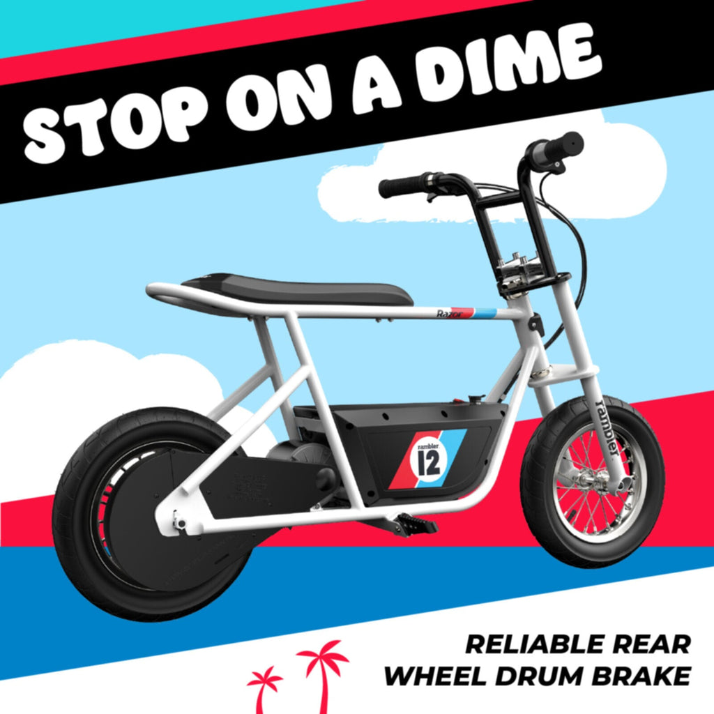 ◆ The Razor Rambler 12 has arrived – A modernized take on the vintage mini bike phenomenon. A combination of style, efficiency, and power make this quality electric minibike a top-of-the-line riding experience for teenagers.