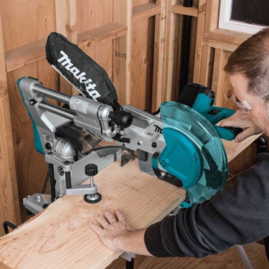 The Makita 10” Dual-Bevel Sliding Compound Miter Saw with Laser (model LS1019L) combines capacity, accuracy, and efficient dust extraction in a more compact size, with a unique 2-Steel Rail Sliding System that offers a reduced footprint for operation flush against a wall. The innovative direct-drive gearbox and guard system is engineered for increased vertical cutting capacity of baseboard (5-1/4”) and crown molding (6-5/8” nested), the largest in its class.