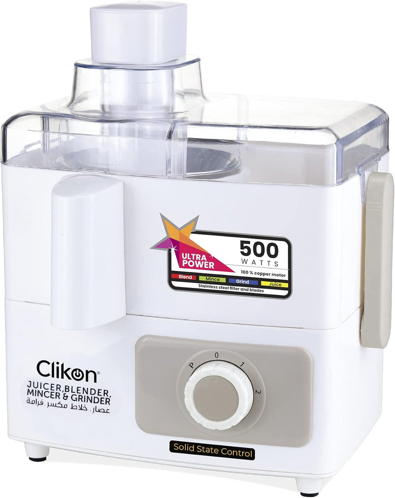 Experience versatility and efficiency in your kitchen with the Clikon CK1501 4-in-1 Juicer Blender. This multifunctional appliance combines juicing, blending, grinding, and mincing capabilities, making it an indispensable tool for daily food preparation. Powered by a robust 500W copper motor, it ensures rapid and consistent performance across various tasks. The shock-resistant 2mm thick ABS body enhances durability, while the stainless steel blades and filter guarantee longevity and optimal results. Safety features like automatic overload and overheat cut-off provide peace of mind during operation. With its compact design and user-friendly controls, the Clikon CK1501 is perfect for both novice cooks and seasoned chefs seeking convenience and reliability.