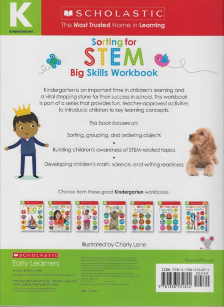 Kindergarten concepts come alive in this Big Skills workbook all about science, technology, engineering, and math from Scholastic Early Learners! A strong educational foundation helps ensure a child is able to benefit from the learning opportunities available at preschool. In Kindergarten Big Skills Workbook: Sorting for STEM, children in kindergarten can practice build their science, technology, engineering, and math concepts in more in-depth ways. The bright colorful pages with a delightful blend of photographs and illustrations make these workbooks some of the most eye-catching and engaging available for this age group. And two pages of stickers will help reinforce the learning and keep little ones excited about entering preschool!Scholastic Early Learners: Interactive books for hands-on learning. Perfect for babies, toddlers, preschoolers, kindergartners, and first graders, too!