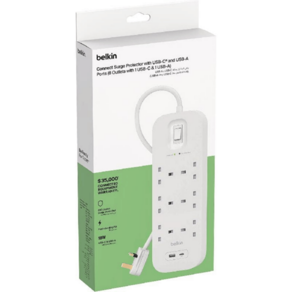 Keep your electronic devices protected from dangerous power surges and spikes with the Belkin 6-Outlet Surge Protection Strip with USB charging Ports. Simply plug the surge protection strip into any AC wall outlet and connect up to six AC electronic devices and fast charge your devices with 18W shared PD power (1xUSB-C, 1xUSB-A) from while keeping them safe from power surges, lightning strikes, and AC contamination. Ideal for televisions, stereo systems, cable boxes, and other home theater equipment, the Belkin Surge Protection Strip is made with high-quality construction and enhanced circuitry to offer premium power protection for your high-end devices and data.