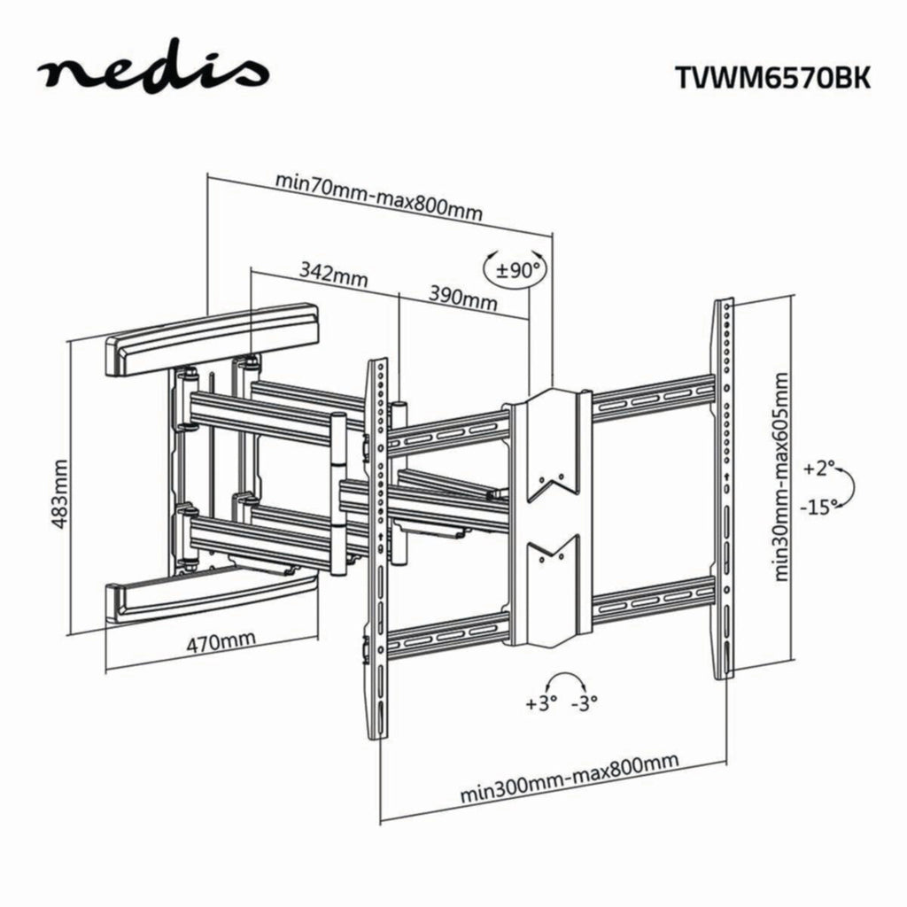 This Nedis® TV Wall Mount is suitable for most television sets with screens ranging from 43†to 90â€. Offering you maximum flexibility for viewing position and the easiest of set ups and installs, this TV wall mount can carry a maximum weight of 70 kg, allows you to adjust the distance from the wall anywhere between 70 to 800 mm for optimal viewing, tilt your TV from +2° to -15° to reduce glare, rotate left or right depending on your viewing position to a maximum angle of 180° and swivel the screen to account for optimal viewing conditions from +3° to -3°.