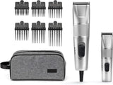 A mains operated clipper with a separate battery mini trimmer and stylish wash bag.