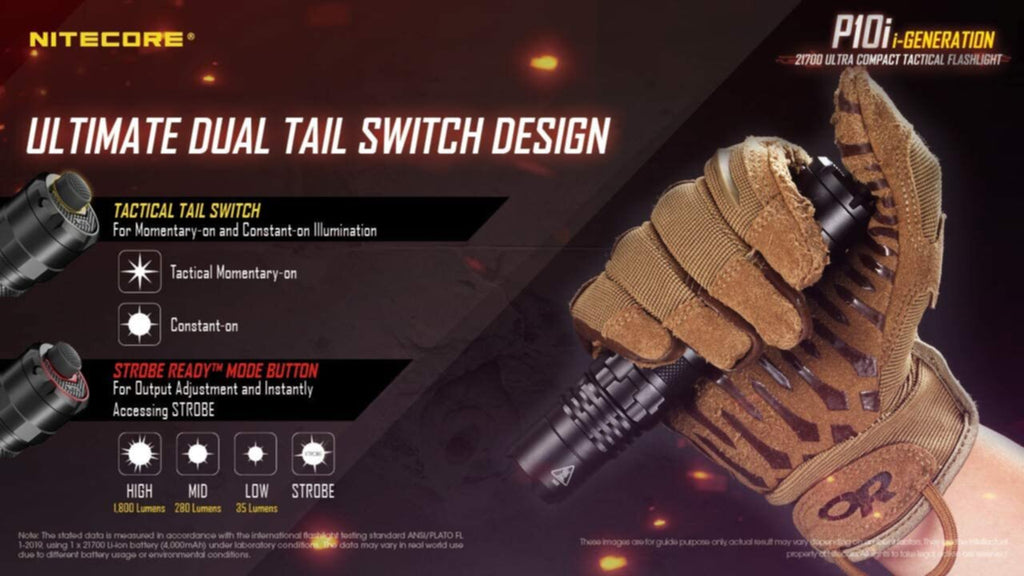 â—† High Performance Tactical Light: The Nitecore P10i emits up to 1800 lumens with a maximum range of 317 yards. Designed with law enforcement and military personnel in mind, this flashlight is easy to operate with 3 levels of brightness and strobe. â—† Strobe: Simply press and hold the mode switch on the tail to activate strobe mode at any time. Non-linear strobe patterns cause enhanced dizziness effects, highly effective in diffusing a tense situation. â—† Rechargeable USB-C: An upgraded 21700i battery enables higher efficiency output and minimizes power loss, for 90 minutes on high and a maximum runtime of 38 hours on low. Recharge the P10i via the fast-charge USB-C port. â—† Ready to use: With an IP68 waterproof rating and shockproof protection, the P10i is ready for high intensity tactical operations. An NTH10 tactical holster is included that is compatible with standard police belts and MOLLE systems. â—† P10i Power Pack - Included in this pack are Nitecore P10i battery, NL2140i battery, CR123 battery charger, NTH10 holster, USB-C charging cable, lanyard, clip, replacement O-ring and a LumenTac battery holster
