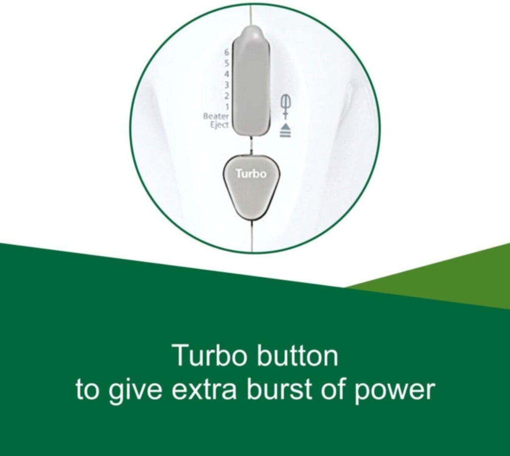 The white HM330 compact and durable hand mixer comes with six speeds plus turbo, twin beaters and kneaders for folding, mixing, whisking and kneading.