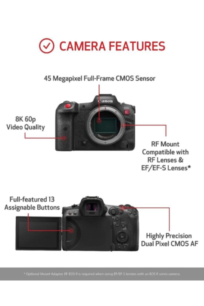 XF-AVC / MXF: 4096 x 2160 (YCC422, 810Mbps) MP4 (HEVC): 8192 x 4230 (YCC422 Explore the best of both worlds in video production and stills photography with the new EOS R5 C, a mirrorless hybrid camera with the capabilities of CINEMA EOS and EOS R system. A compact and lightweight system with 8K/60P resolution video recording is born. The all-new internal cooling fan system allows continuous internal recording in various file formats, including Cinema RAW Light, XF-AVC, and MP4 â—† 45MP full-frame CMOS sensor â—† 8K/60P RAW internal recording, with dual card slots â—† 4K/120P in 4:2:2, 10-bit resolution, C-log 3, HDR support with HLG and PQ formats â—† New internal fan cooling unit for nonstop video recording |