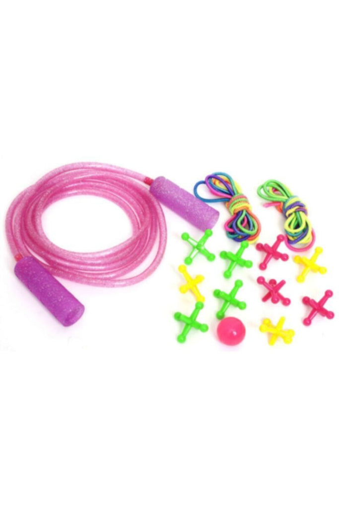 Get your jump on with Goofy Foot Designs Deluxe Jump Rope Set! This deluxe variety pack comes with a glitter infused 7 foot long jump rope, 10 jacks and ball, and 2 chinese jump ropes! Keep kid’s busy with a healthy exercise routine! Perfect for outdoor or indoor play! Kids aged three and up will have so much fun, they'll forget they're exercising with the Goofy Foot Designs Deluxe Jump Rope Set. The set includes a seven foot long jump rope which helps kids improve their hand-eye coordination and motor skills as they play. With two durable plastic handles for a secure grip and long-lasting play, this jump rope is perfectly sized for little ones to have hours of fun while getting lots of excellent cardiovascular aerobic exercise. This Deluxe Outdoor Set makes a wonderful holiday, birthday, or Christmas gift.