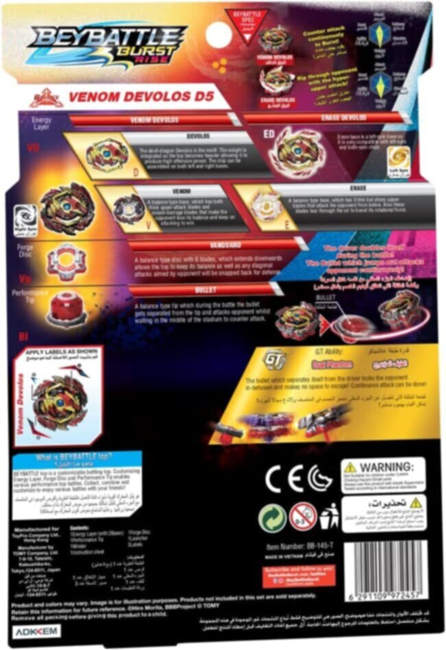 Top includes die-cast metal parts for a heavy weight. Venom Devolos attack type top is dual-spin compatible, and features rubber bristles in the performance tip for a gradual attack increase.This Starter Pack includes 1 Beyblade Burst Pro Series right-spin launcher, sticker sheet, and 1 right-spin competitive battling top.